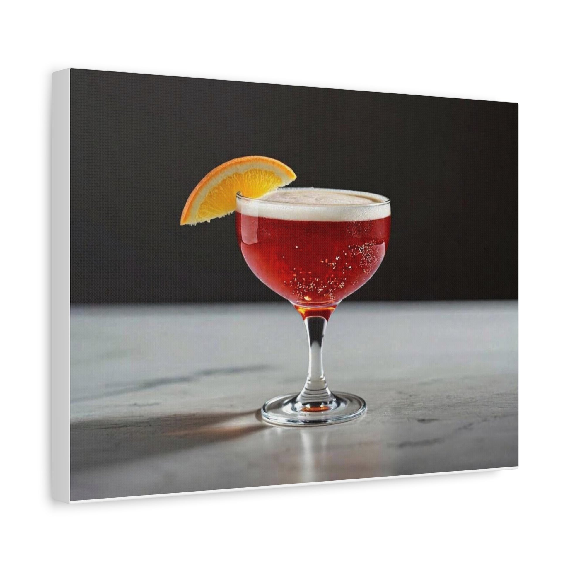 A slim, museum-style matte canvas print that captures a single cocktail moment — a ruby-hued, effervescent drink topped with a delicate foam and a bright citrus wedge. The soft, non-reflective surface keeps the image intimate and tactile, while the stretched pine frame gives the piece a light, sculptural presence on the wall. Hang it in a home bar, a cozy kitchen nook, or a small restaurant to evoke quiet evenings and attentive craft. The restrained composition and deep background let the drink become the scene’s focal point, inviting slow conversation and the ritual of a well-made pour.