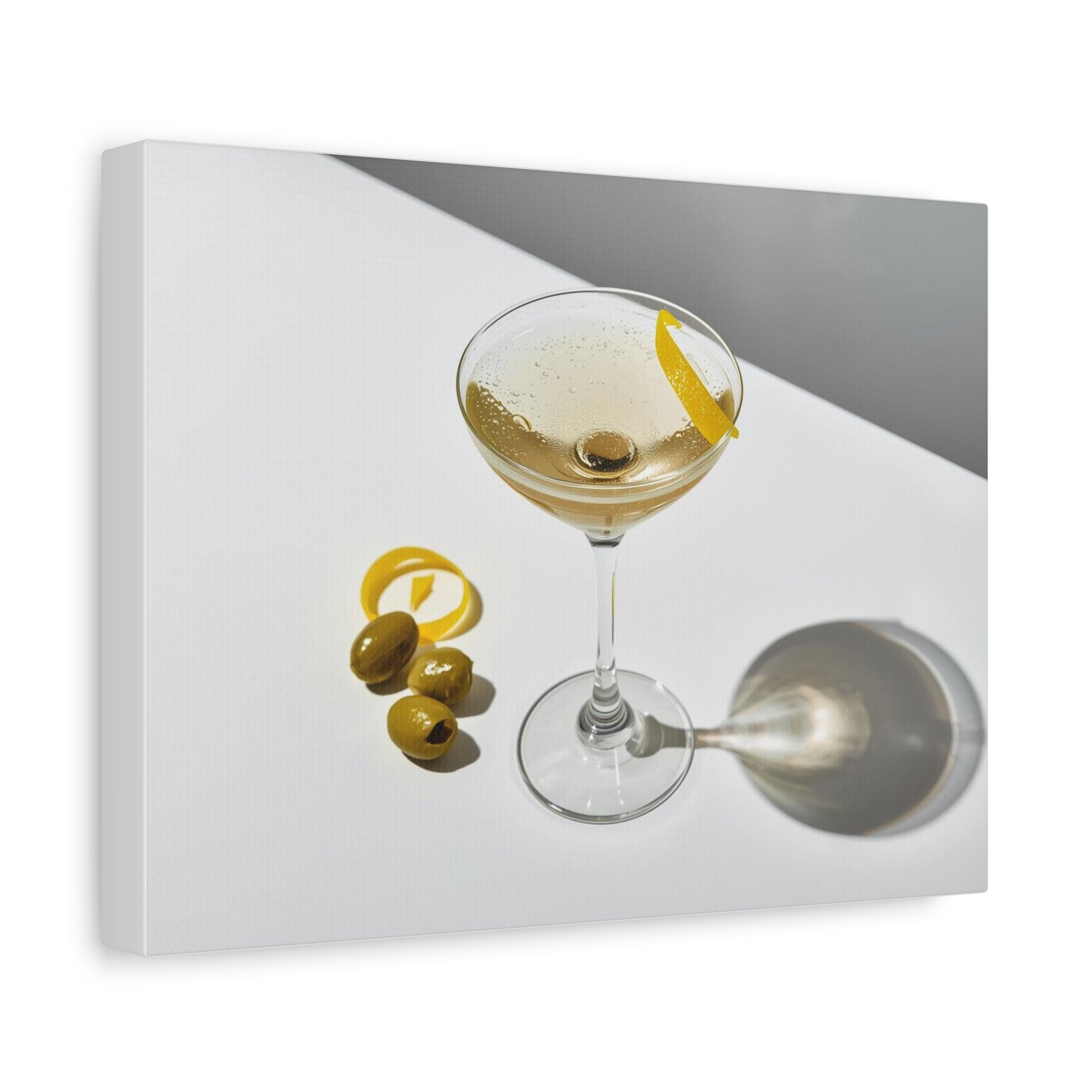 A clean, modern matte canvas print that showcases a sunlit martini and olive still-life in crisp detail. The soft shadows and minimalist composition give the piece a calm, slightly playful mood — like a quiet bar at golden hour. Stretched on a slim 1.25" pine frame, the image sits flush and ready to hang, with subtle rubber feet on the back to keep the canvas sitting true against the wall. Printed with latex inks and a specialty coating, the tones stay faithful and fade-resistant, bringing a refined, gallery-like presence to kitchens, dining nooks, home bars, or stylish living rooms.