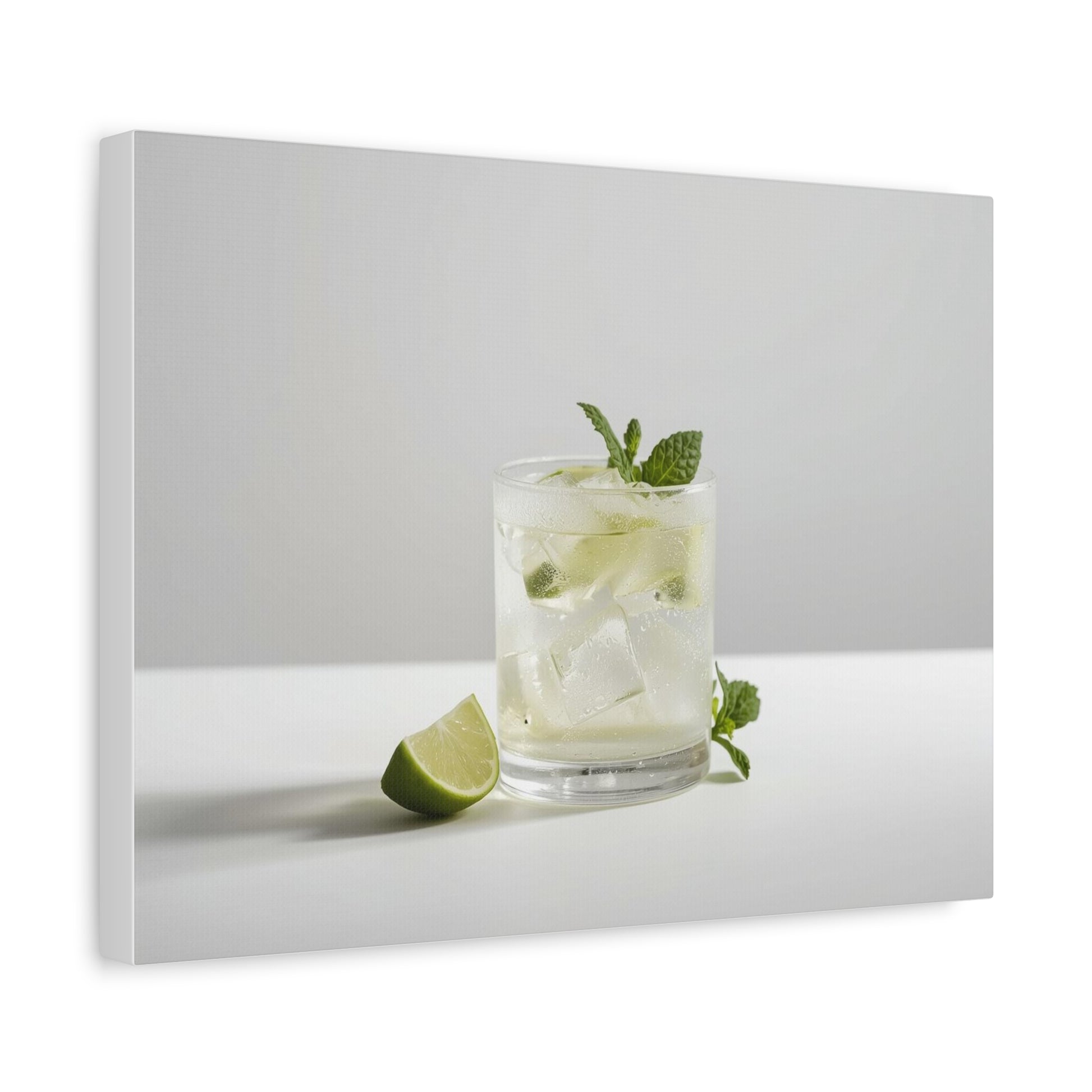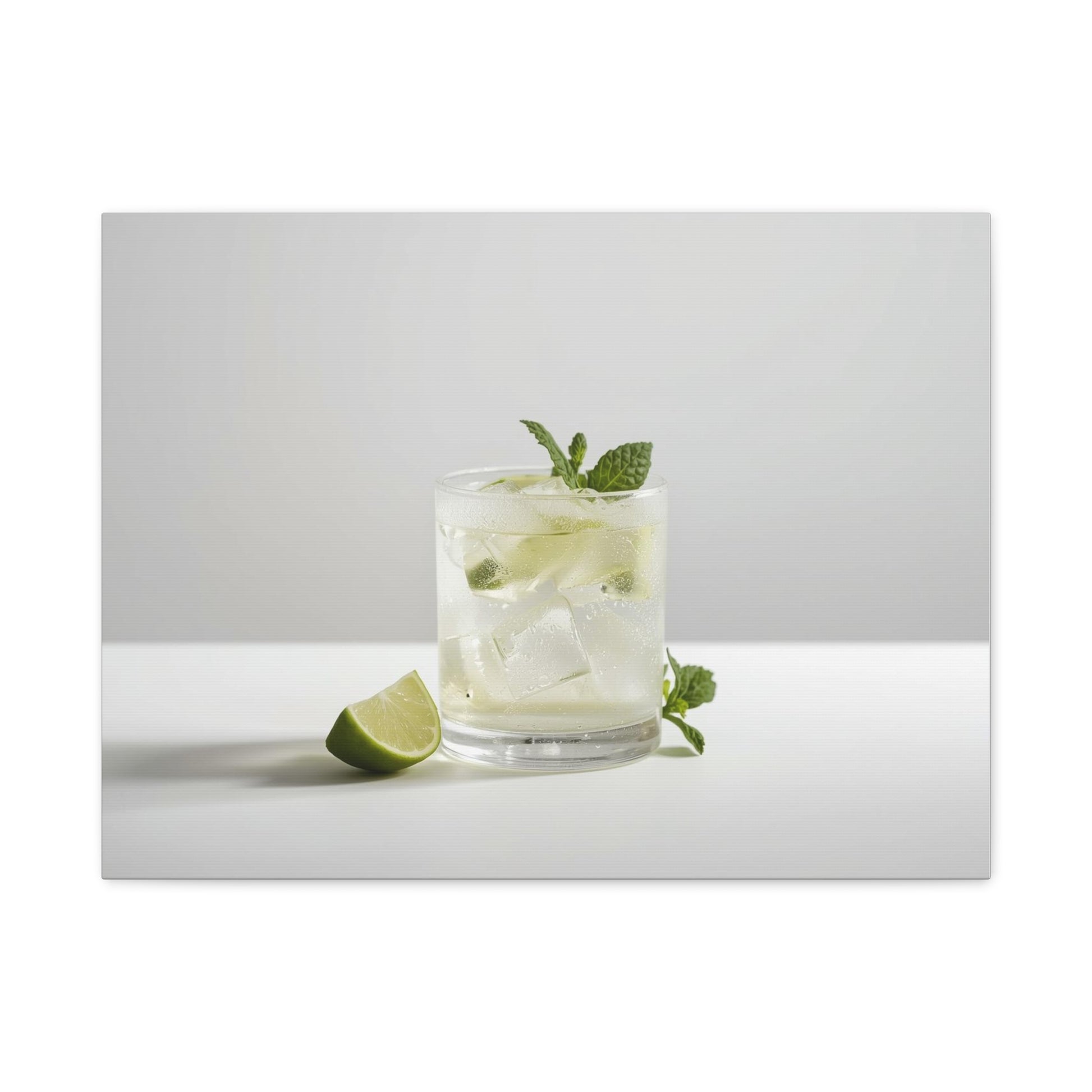 A crisp, minimal matte canvas print that brings a quiet moment of refreshment into your space. The image — a glass of lime-mint refreshment on a soft gray background — feels like a breath of cool air on a sunlit counter. Mounted on a slim 1.25" pine profile, the stretched canvas sits close to the wall for a modern, gallery-ready look. Subtle texture from the cotton-poly canvas and the muted matte finish keep reflections low and colors natural, so the delicate greens and soft whites remain calm and true. Small rubber dots on the back keep the piece steady on the wall, and a secure back-hanging system makes installation straightforward. Sustainable materials and non-toxic latex inks mean you can enjoy the artwork with a light footprint and confident peace of mind.