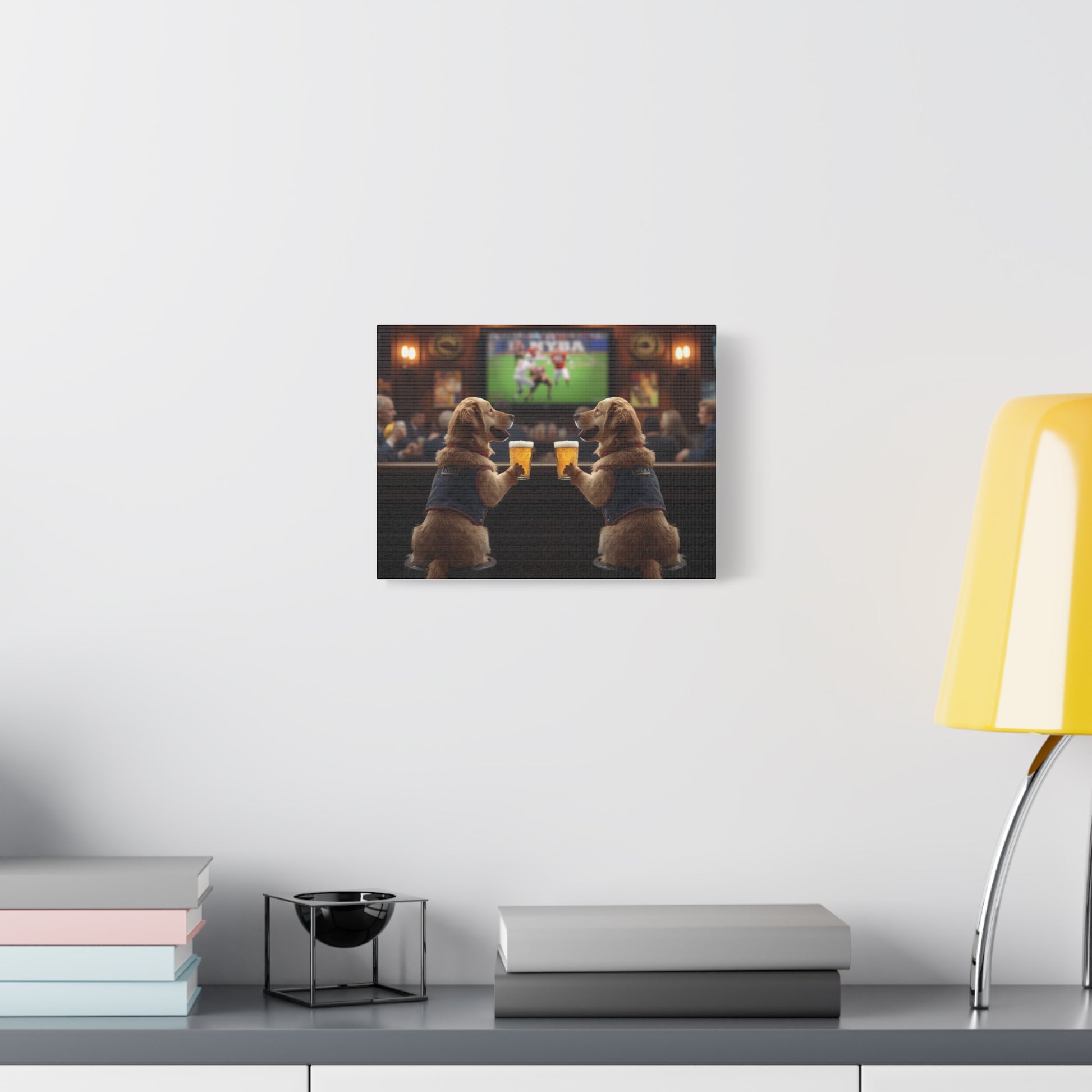 Two golden retrievers clink frothy pints in a cozy pub while a big match plays on the screen — this stretched matte canvas brings that warm, playful scene into your space. The rich, museum-quality matte finish keeps glare low and colors deep, making the dogs’ fur and the pub’s amber lighting feel tactile and inviting. Hang it above a bar cart, in a rec room, or over a favorite chair to invite laughter and easy conversation. It reads like a snapshot of camaraderie: tails wagging, beers raised, and the shared thrill of the game. The durable stretcher frame and subtle rubber feet protect your wall and keep the print steady, so the moment stays framed and ready for every watch party or quiet afternoon at home.