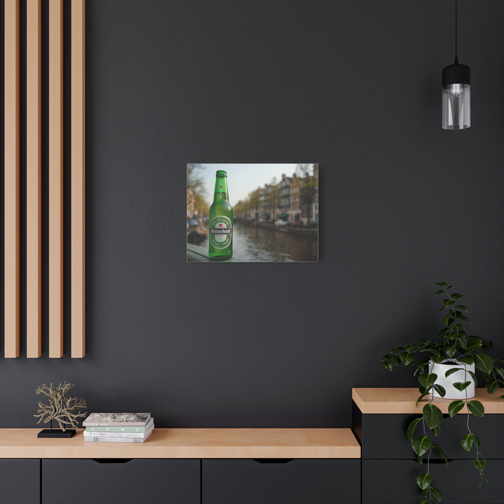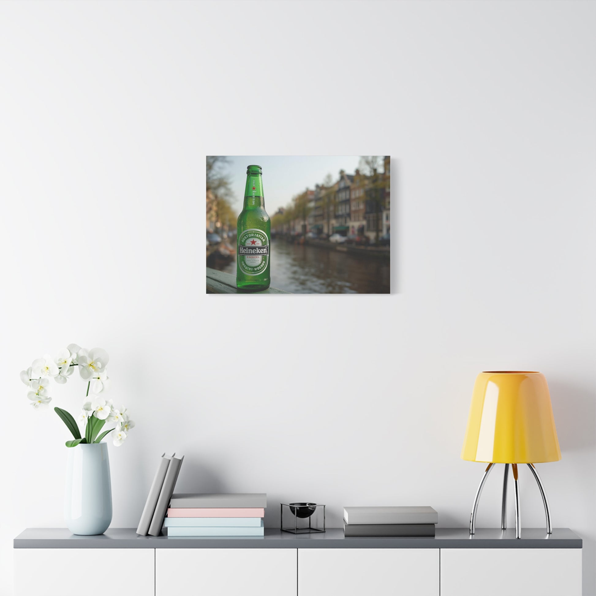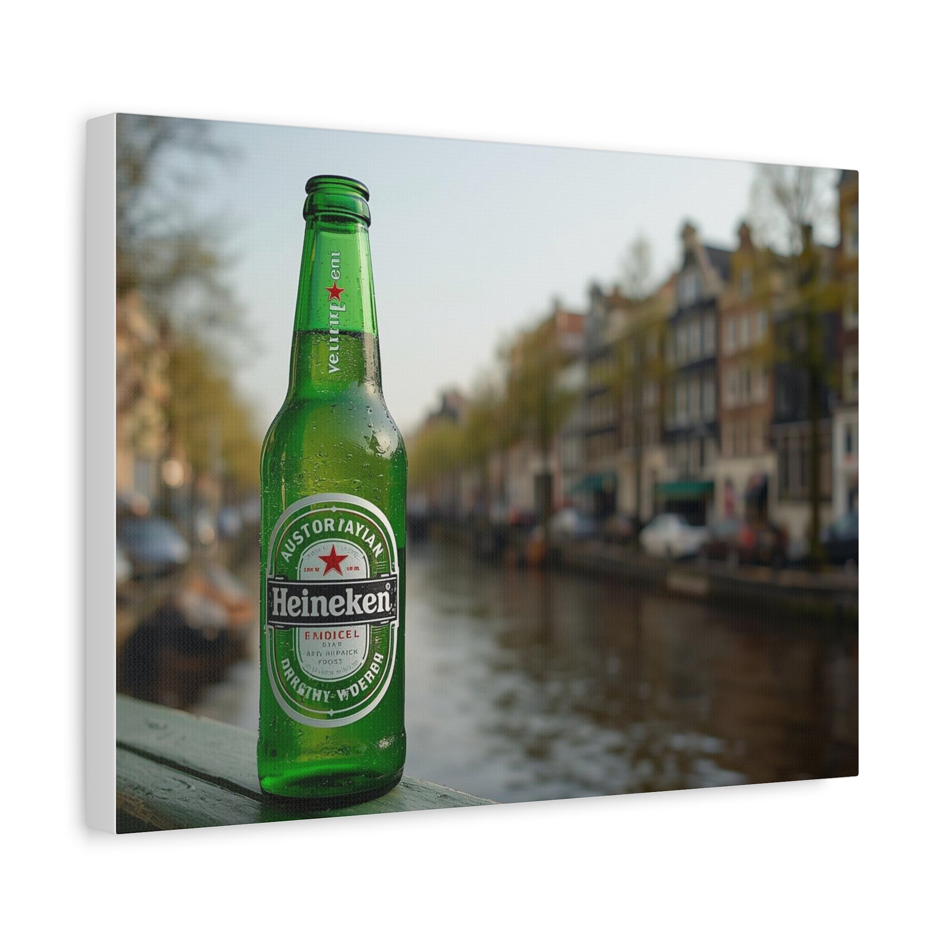 A relaxed, atmospheric matte canvas print that captures a quiet canal evening with a single green beer bottle in soft focus. The stretched 1.25" profile gives the image presence on the wall while keeping a clean, modern silhouette. The muted background of canal houses and water blurs into a warm bokeh, letting the bottle’s color and label anchor the scene. This piece feels like a memory from a slow stroll through a European city—good to hang where conversation lingers: kitchen nooks, home bars, or living rooms where travel stories come out after dinner. Printed with low-VOC, UL-certified Greenguard Gold inks on a durable cotton-poly canvas and mounted on responsibly sourced pine, it brings that easy, unhurried mood into everyday spaces without shouting for attention.