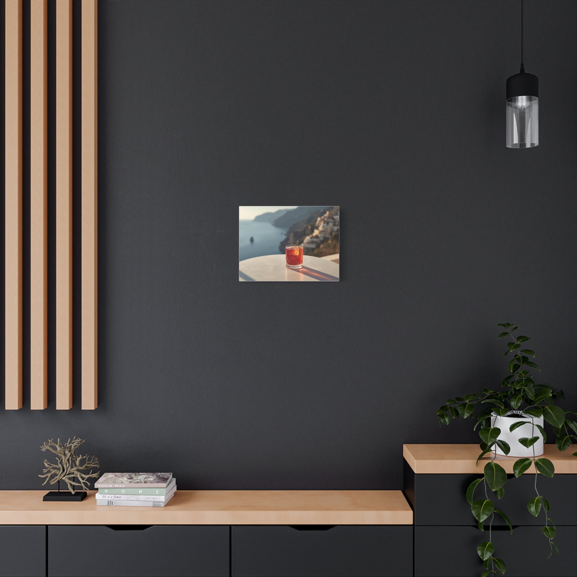 Sunset Aperitivo on Canvas — a stretched matte canvas print that brings a quiet Mediterranean moment into your home. A single glass of a ruby-hued cocktail sits on a sunlit terrace, the sea and cliffside village softened into a warm, dreamy blur. This piece feels like the pause between conversation and nightfall: gentle light, slow shadows, and a lingering citrus note captured in color and composition.